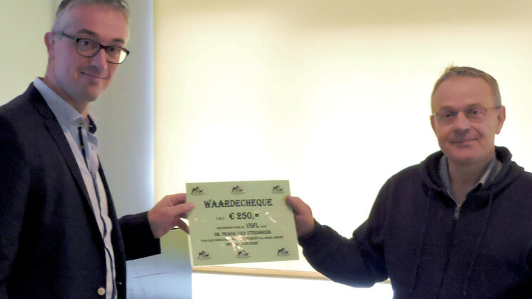We kregen weer geweldig nieuws voor het onderzoek naar levershunts van Frank van Steenbeek. Van de Vereniging voor Schnauzer Fokkers en Liefhebbers ontving het onderzoek een cheque met een donatie van maar liefst €250! Op de foto neemt Frank van Steenbeek de cheque in ontvangst. Naast het bedrag op de cheque is er 1500 euro gedoneerd door de genereuze aanwezigen. Frank van Steenbeek en het team van Vrienden Diergeneeskunde zijn erg blij met deze geweldige donaties!